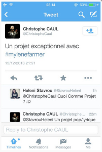 Mais, le ténor a ensuite supprimé ses premiers tweets et posté des messages plus ambigus avant d'annoncer clairement qu'il ne s'agitt que d'un projet autour de chansons de Mylène mais sanscollaboration directe avec elle :