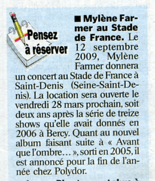 EVENEMENT: Mylène Farmer au Stade de France en septembre 2009
