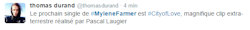 Le journaliste Thomas Durand (qui a interviewé deux fois Mylène pour "Gala" notamment en novembre 2015) annonce sur twitter : "Le prochain single de #MyleneFarmer est #CityofLove, magnifique clip extra-terrestre réalisé par Pascal Laugier."