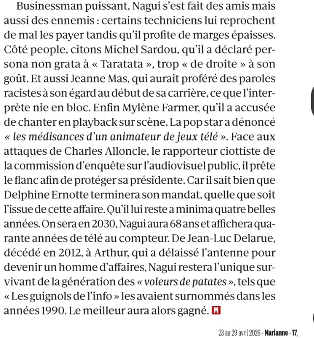 Retour sur l'inimitié entre Mylène et Nagui, dans le portrait que le magazine Marianne consacre à ce dernier.