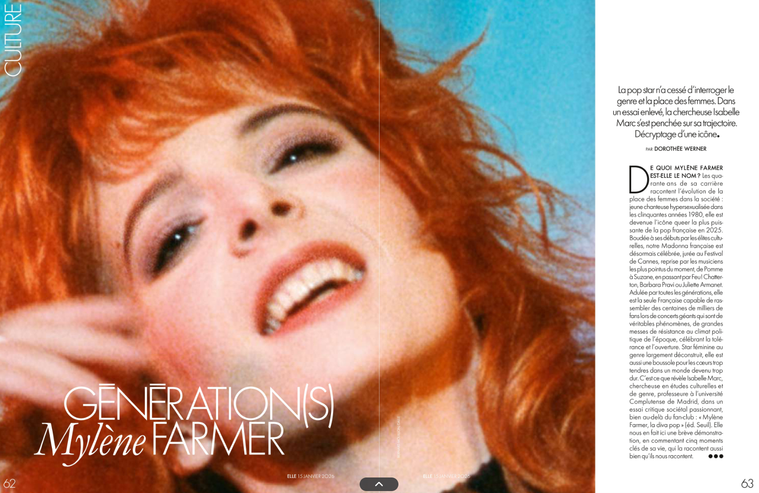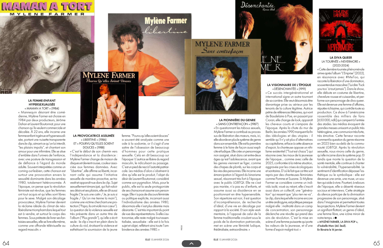 Dans le ELLE du 15 janvier 2025, quatre pages titrées "Génération(s) Mylène Farmer". On y retrouve les bonnes feuilles du livre "Mylène Farmer le diva pop", d'Isabelle Marc (ed. Seuil).
