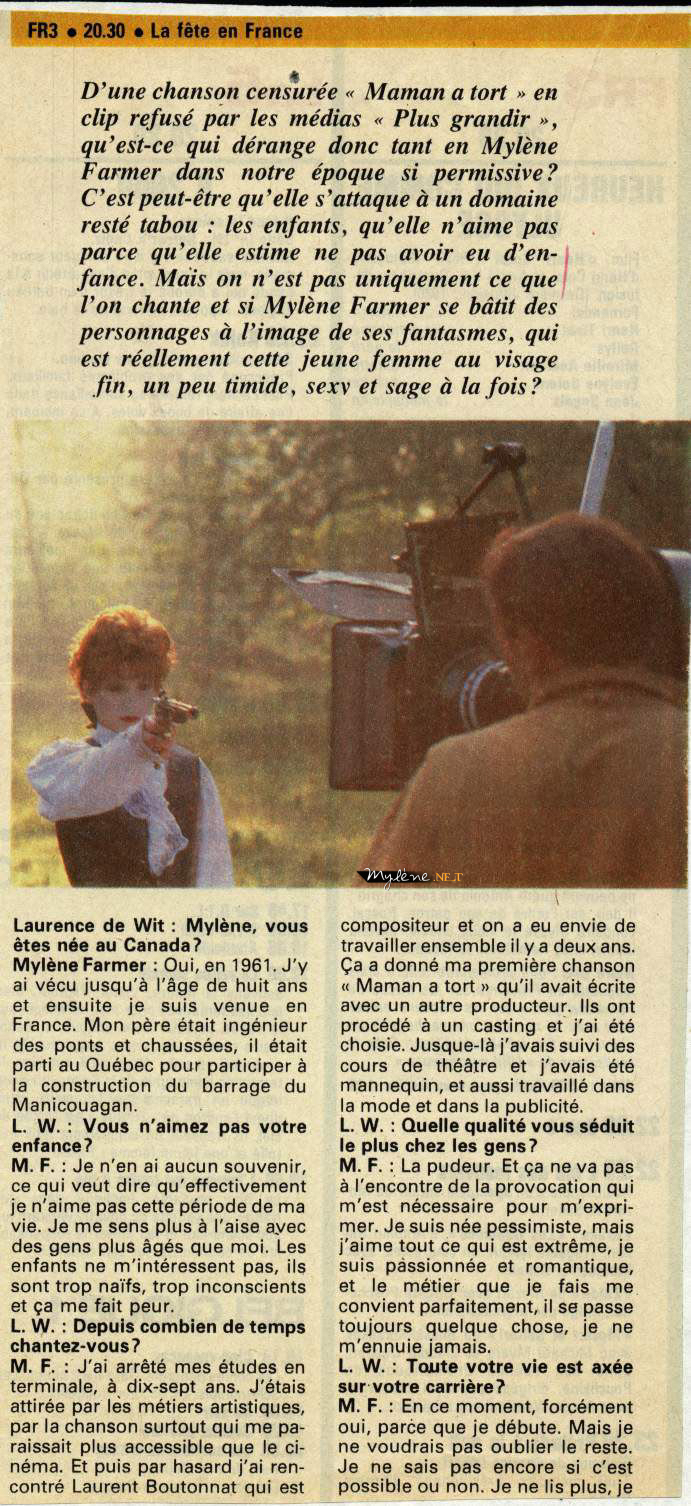 Mylène Farmer : J'ai arrêté mes études en terminale, à dix-sept ans. J'étais attirée par les métiers artistiques, par la chanson surtout qui me paraissait plus accessible que le cinéma. Et puis par hasard j'ai rencontré Laurent Boutonnat qui est compositeur et on a eu envie de travailler ensemble il y a deux ans. Ça a donné ma première chanson Maman a tort qu'il avait écrite avec un autre producteur. Ils ont procédé à un casting et j'ai été choisie. Jusque-là j'avais suivi des cours de théâtre et j'avais été mannequin, et aussi travaillé dans la mode et la publicité.